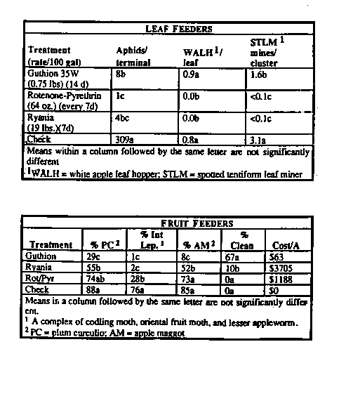 Results: The weekly schedule of rotenone-pyrethrin was effective against the foliar feeders and rosy apple aphid (RAA), but did not adequately control the plum curculio (PC) or apple maggot (AM). the weekly sprays of ryania provided excellent control `,f; the foliar feeders and intermediate lepidopterans.(a . complex of codling moth, oriental fruit moth, and; lesser apple worm). However, this material was not effective against either the PC, AM, or San Jose scale (SJS). Population of both ERM and predaceous mites were extremely low in all of the plots throughout the season and differences among the treatments and the check plot were generally not statistically significance The cost of the insecticides were only material costs and did not include application costs. While most growers would not apply and could not afford a full season program of the botanical insecticides, we felt it was important to include the costs for comparison purposes. For reference, commercial growers in NY who use synthetic fungicides, miticides and insecticides for season long pest control generally spend under $200/A.