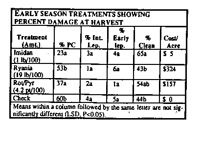 Treatments for early season pest control (plum curculio, codling moth, fruit worms and leafrollers) consisted of the fallowing. 1)a dilute sprays of Imidan at petal fall (5/31); 2) ryania at PF (5/31 ) and 8 days later (6/8); and 3) rotenone-pyrethrin at PF (5/31), 4 days later (6/ 4), and again 5 days (6/9).
