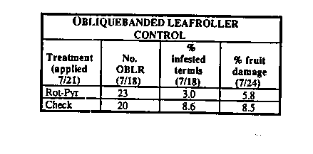 The rotenone-pyrethrin treatment did provide some control of obliquebanded leafroller. However, other studies conducted in NY in 1989 have shown that a Dipel application at peak egg hatch provides as good control of summer obliquebanded leafroller as any of the other currently registered synthetic pesticides. Because Dipel appears to be more effective, and the cost of the botanicals is higher, Dipel should be if,. pesticide of choice in organic orchards when control of obliquebanded leafroller is needed.